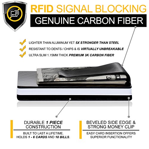 • New & improved design - our superior 1 piece exclusive design is extremely strong and impressively minimal conveniently allowing EDC (every day carry) of your credit cards, cash, and id. This compact 100% genuine carbon fiber "Gloss finish" cardholder will fit comfortably in any pant, trouser, or shirt pocket has a smooth outer ridge and was built to last. Reduce the bulk while still carrying 1 - 6 cards & 10 bills securely!