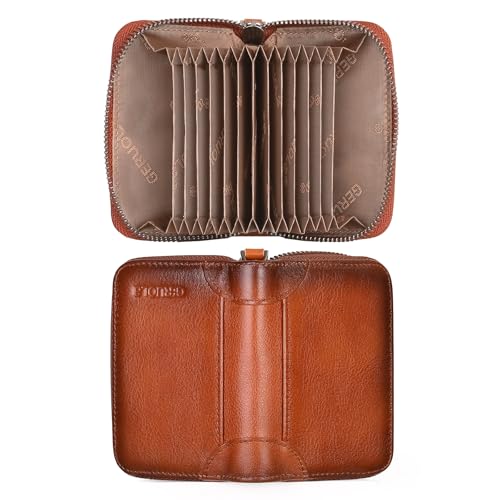 Genuine Leather Credit Card Holder Case RFID Blocking Travel Passport Wallet, Small Card Case for Men Accordion Wallet with Zipper ,Compact Size (Brown) 1