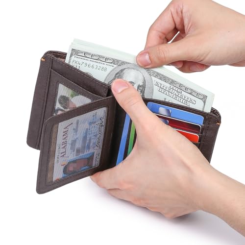 Mens Wallet Genuine Leather Bifold RFID Blocking Wallet for Men with 3 ID Windows 7 Card Holders 1 cash pockets 6