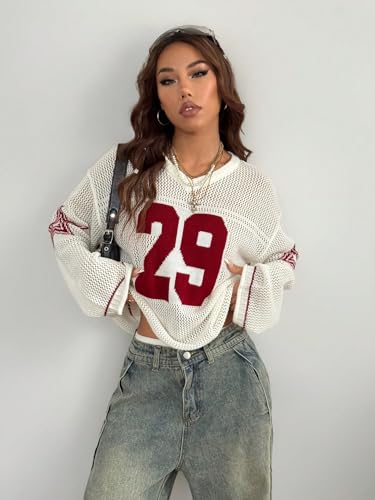 • Features: The long sleeve jersey sweater is featured with number graphic print and crochet hollow out design, which is stylish and eye-catching. The v neck jersey shirt offers you a pleasant touch.