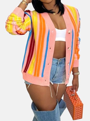 HOT ! Women’s Striped Knit Cardigan Colorful Button Down V Neck Long Sleeve Rainbow Cardigan Sweaters