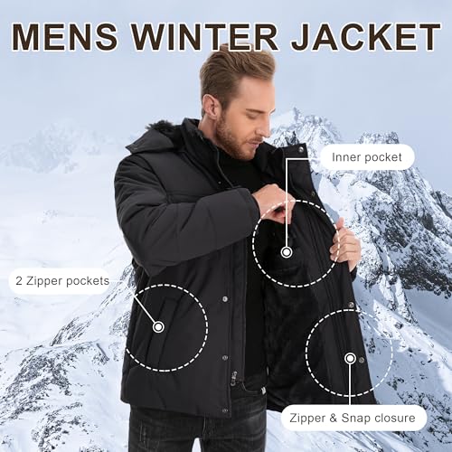 • [WARMTH]: Mens winter jacket with fur hood is made of windproof and snowproof fabric, full zipper closure (up to the neck), outer layer with buttons, lined with plush fleece, enough to withstand the cold winter.