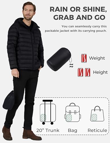 • Packable Winter Jackets for Men - This lightweight winter jacket can be easily folded into the matching drawstring pouch.Our men's foldable, lightweight insulated puffer coat is ideal for casual wear and outdoor.