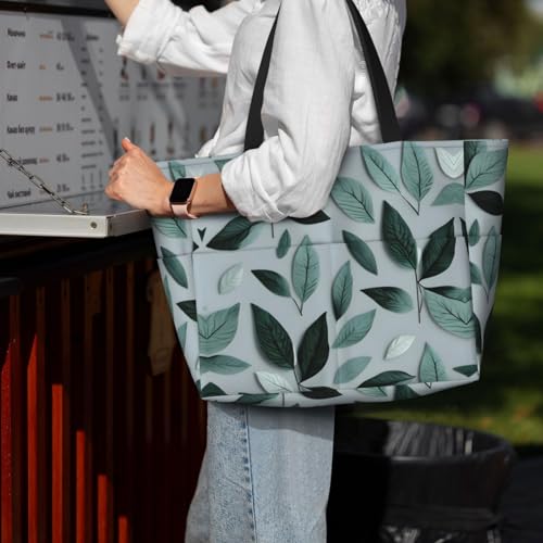 HOT ! Mint Gray Leaf Large Beach Tote Bag Women Beach Tote Bag For Pool Gym Grocery Travel With Multiple Pocket