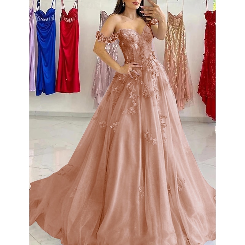 HOT ! A-Line Prom Dresses Elegant Dress Formal Sweep / Brush Train Sleeveless Sweetheart Tulle with Pleats Sequin Appliques Masquerade Dress
