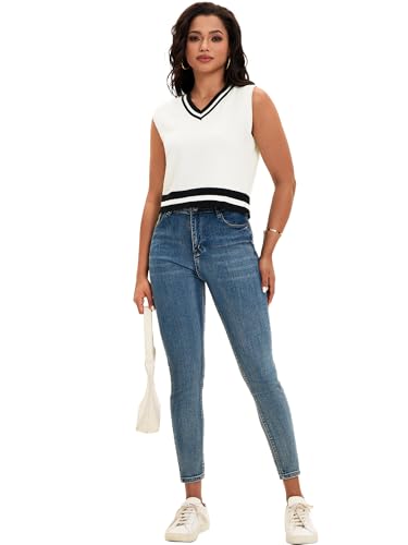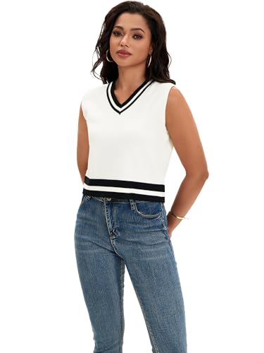 HOT ! Womens Cropped Sweater Vest V Neck Sleeveless Loose Fit Tank Tops Striped Knit Lightweight Pullover Fall Sweaters