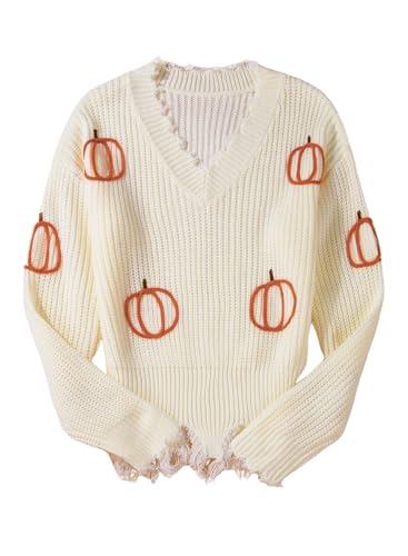 • STYLE - Women's fall oversized sweaters, v-neck, long sleeve, drop shoulder, pumpkin pattern, raw edges, cable knit, loose fit. Suitable for layering or wearing alone.