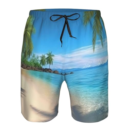 HOT ! Hawaiian Beach with Palm Trees Men's Swim Trunks Quick Dry Board Shorts with Pockets Casual Drawstring Beach Shorts