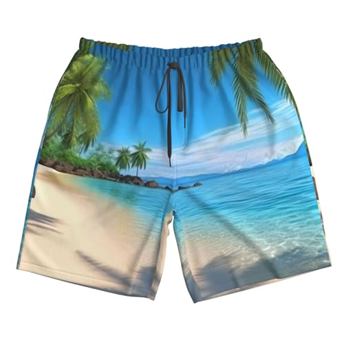 • Hawaiian Beach with Palm Trees Printed Swim Trunks for Men: These surf shorts can be worn in and out of the water during summer vacation. Our Men's Sweat Shorts Swimsuits using dye-sublimation technology that allows graphics lifelike, vibrant colors and comfy material will bring you a cool summer