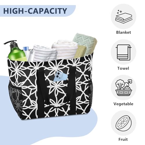 europen geometric floral white black Utility Bags And Totes Reusable Grocery Shopping Bags Foldable Beach Tote Bag With Pockets Canvas Laundry Tote Bag 7