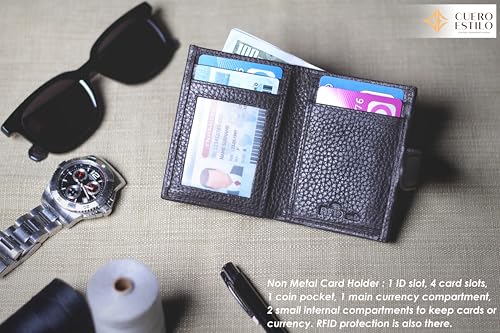 • Optimum Protection: Designed to keep your cards safe from bending, this non-metal card holder features 1 ID slot, 4 card slots, 1 coin pocket, 1 main currency compartment, and 2 small internal compartments to store cards or currency. The advanced RFID-secure lining protects your credit and debit cards from unauthorized scans, ensuring your personal information remains secure.