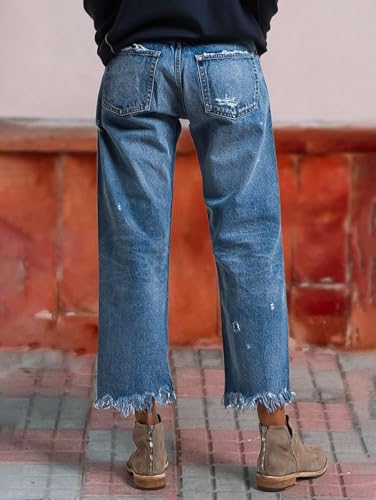Flamingals Straight Leg Mid Rise Ripped Wash Raw Hem Casual Denim Bootcut Barrel Pants 4