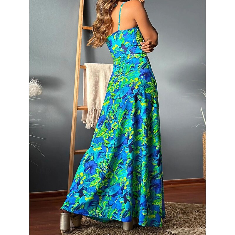 : The dress features a striking backless design with adjustable spaghetti straps and a deep V-neckline for an elegant and modern touch. It showcases a vibrant tropical print with floral and leaf patterns in shades of green and blue, capturing a fresh, lively essence. The gathered waistline enhances its chic and structured appearance, while the long, flowing skirt brings a sense of effortless sophistication.