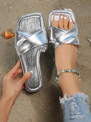 GORGLITTER Women's Silver Sandals Criss Cross Slip on Sandals Square Toe 2025 Trendy Vacation Sandals