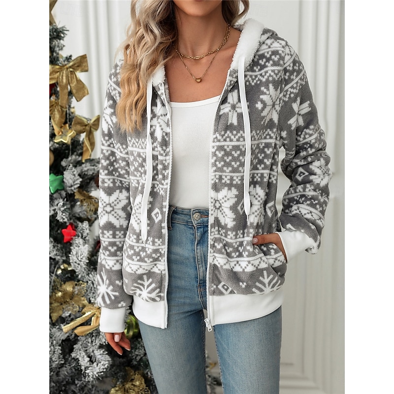 Women's Fleece Jacket Sherpa-Lined Hooded Full-Zip Winter Snowflake Print Grey and White Cozy Warm Casual Outerwear Multiple Sizes