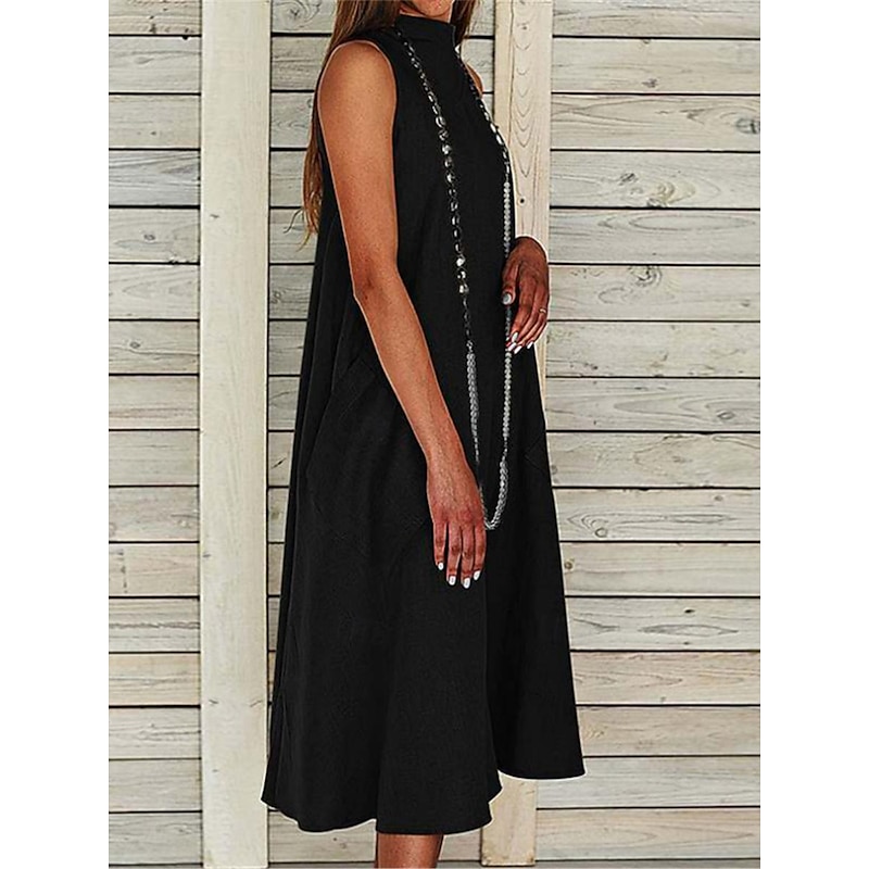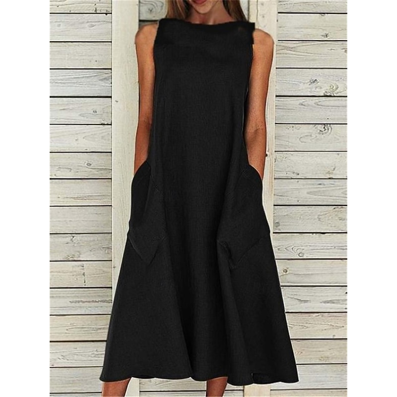 Women's Midi Dress Sleeveless Pockets Casual A-Line Silhouette Round Neckline White Summer Versatile Regular Fit Comfortable Lightweight Breathable Clothing Apparel 9