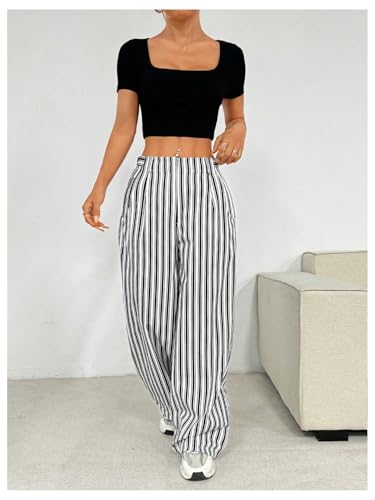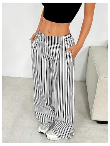 HOT ! MakeMeChic Women's Striped Pants Wide Leg Elastic Waist Long Trousers with Pockets