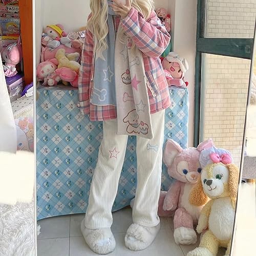 More information about LAPRBY Cute White Corduroy Pants for Women Cartoon Embroidery High Waist Harajuku Kawaii Wide Leg Trousers Y2K Pants