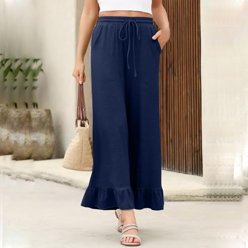 HOT ! Womens Wide Leg Pants Drawstring Elastic High Waisted Ruffle Hem Pants with Pockets Casual Flowy Beach Pants Culottes
