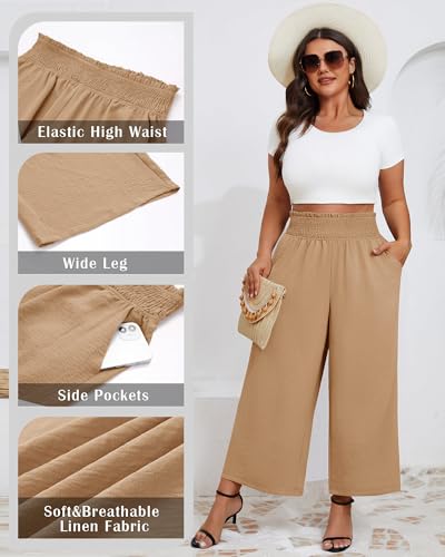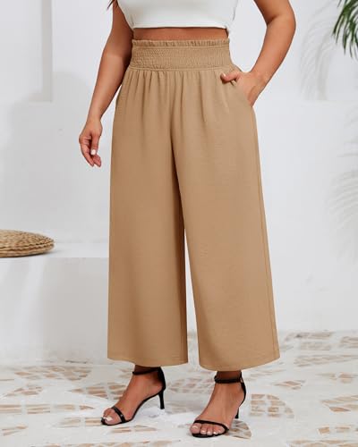 HOT ! Neer Women's Plus Size Wide Leg Pants, Summer Stretchy Lounge Pants with Pockets Pull On Elastic Flowy Palazzo Trousers(Khaki,3XL)