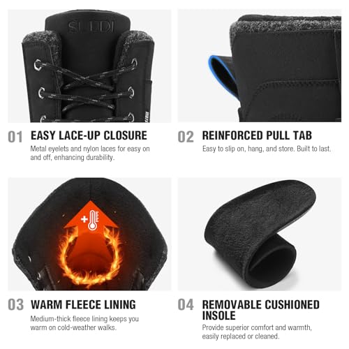 • Winter Warmth: SUEDI men's duck boots feature 200g insulation, a medium-thickness fleece lining, and a removable thin fleece insole, creating an internal warmth system. Whether it's snowing or windy outside, these mens snow boots keep you warm and cozy