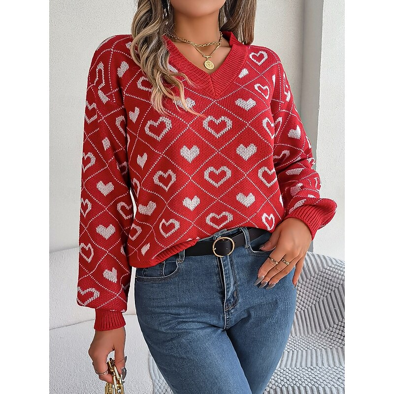 Women's Sweater Casual Soft Heart Ribbed V Neck Knitted Long Sleeve Regular Tops Knit Outdoor Daily Weekend Pink Red Fall Winter 15