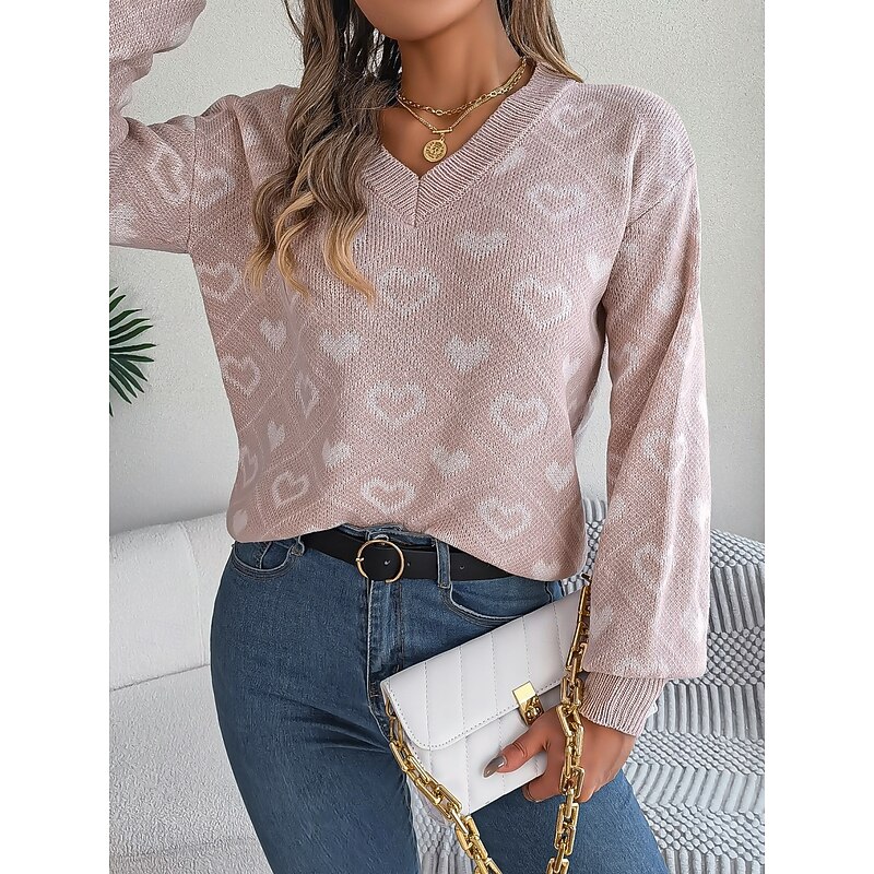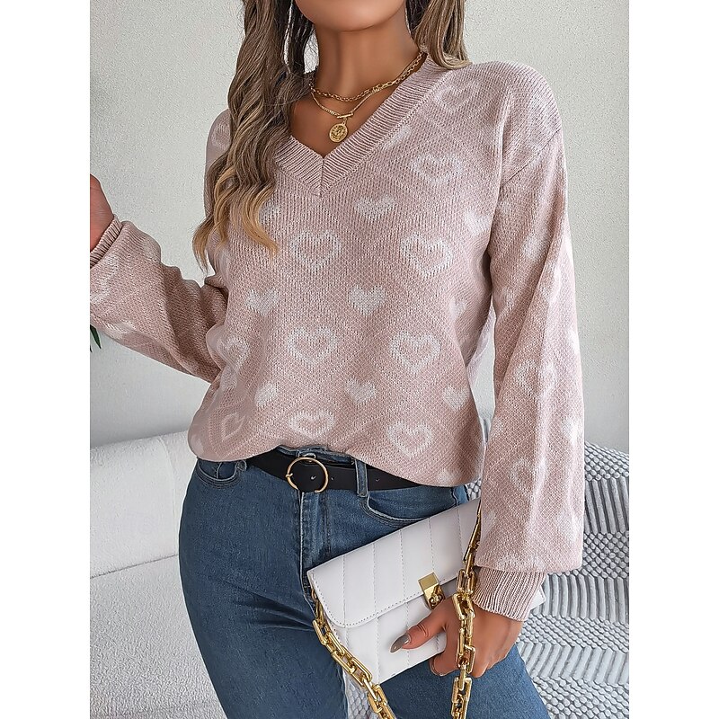 HOT ! Women's Sweater Casual Soft Heart Ribbed V Neck Knitted Long Sleeve Regular Tops Knit Outdoor Daily Weekend Pink Red Fall Winter