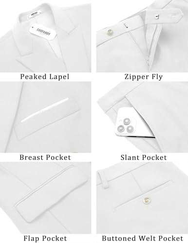 • Classic Design: The suit jacket includes 2 flap pockets, 1 inner pocket, and 1 chest pocket. Structured shoulder pads and side vents ensure a sharp fit. The suit pants have a button-zip fly and an elastic waistband for a comfortable fit on all body types