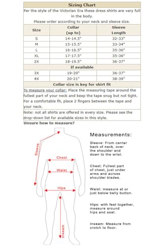 • Victorian men wore Vests and Sleeve Garters to create a custom fit in the body and sleeves. Please consult our sizing chart and order according to your neck and sleeve size