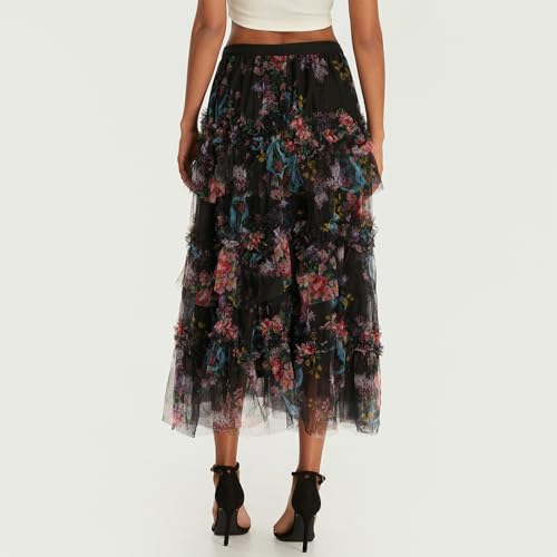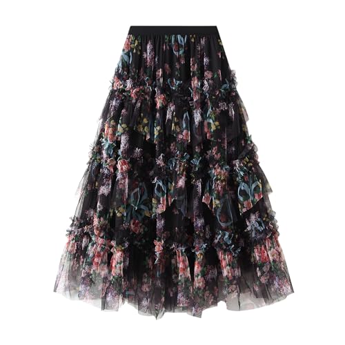 • Design: Vintage and elegant floral printed midi skirts for women, high elastic waist dressy skirts with 3-layers; one layer of floral mesh, one layer of solid tulle, one layer of satin lining, flowy hem, irregular ruffle tiered trim, a-line style, sparkly skirts for women summer