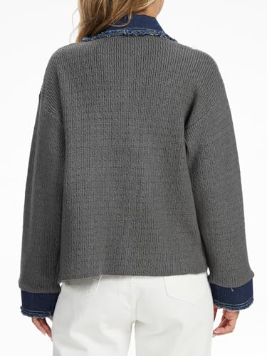 Womens Patchwork Denim Cardigan Sweater 2025 Fall Winter Button Down Long Sleeve Chunky Knit Cardigan with Pockets