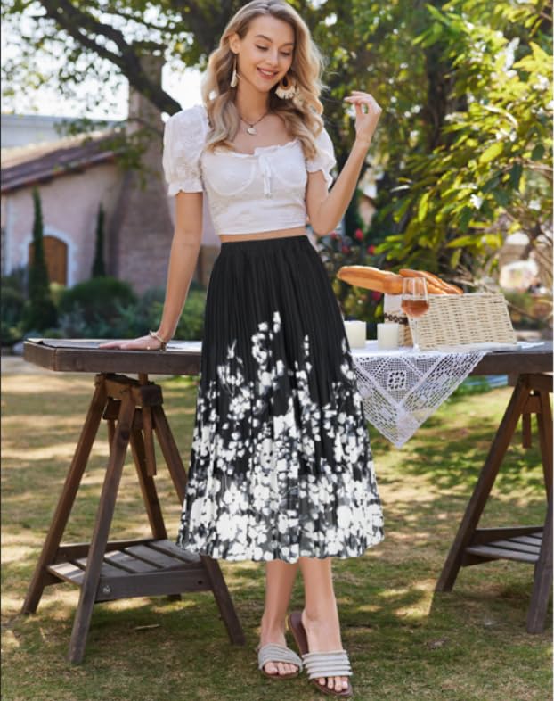 OBBUE Women's Chiffon Pleated Skirts Elastic High Waist A-line Midi Skirts for Casual Party Holiday 2