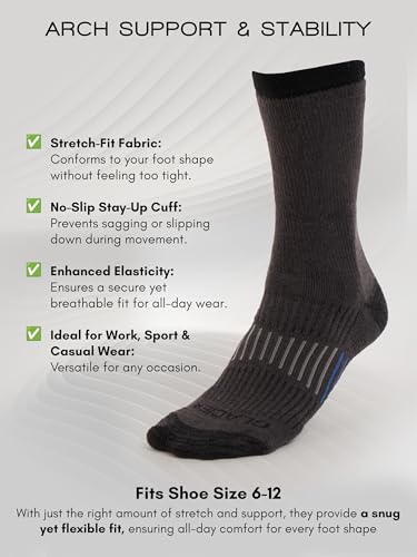 • MOISTURE-WICKING - UNMATCHED PERFORMANCE WITH EVERY STEP: Engineered with moisture-wicking fibers, our socks keep your feet dry and fresh all day. The arch support, Achilles shield, and comfort toe seam work together to reduce fatigue and prevent irritation, while the stay-up cuff ensures they remain perfectly in place. Say goodbye to discomfort and hello to lasting comfort and performance