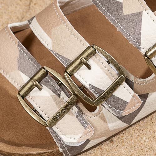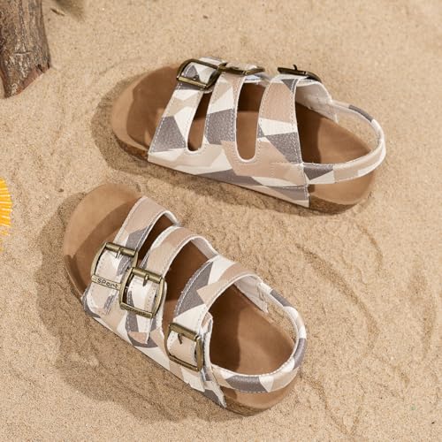 Kids Cork Footbed Sandals, Camo Print Design, Adjustable Buckle Straps, Beige and Gray 7