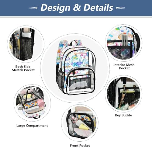 Size of Backpack: 10.6 x 7 x 15.7 in/27 x 18 x 40 cm. Daily commute, student book bag, tablet backpack and more. Multiple color and pattern options.Capacity and Structure: IOO% polyester+PVC material. 13L capacity can meet different needs to go to school and travel. Built in 1 large capacity main compartment, 1 small mesh pocket, 1 front compartment and 2 side mesh pockets, which can store your books, notes, pens, umbrellas, water bottles and other items.PVC Transparent Backpack: Clear daypack is unisex and flawless for everybody. Clear PVC to have everything in sight. Expect all security checks to be as fast as lightning. Clear backpack for women and men is introduced in different patterns - animals clear backpack, flowers clear backpack, sports clear backpack, video game clear backpack.Ideal Gift: Top back to school season gift for kids - New Years gift, Christmas gifts, Birthday gift. Perfect for daily use, school life, weekend getaways and other outdoor activities.Personalized Pattern: Vibrant, colorful and funny school backpack shows your personality. Available in various colors and patterns, you will find one attract youοΌ Perfect for everyday use. premium materials and excellent craftsmanship ensure long-lasting durability.