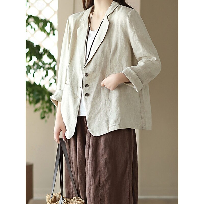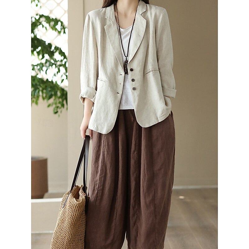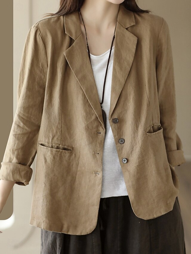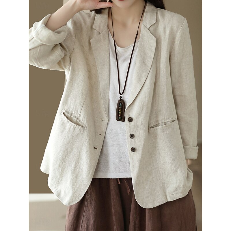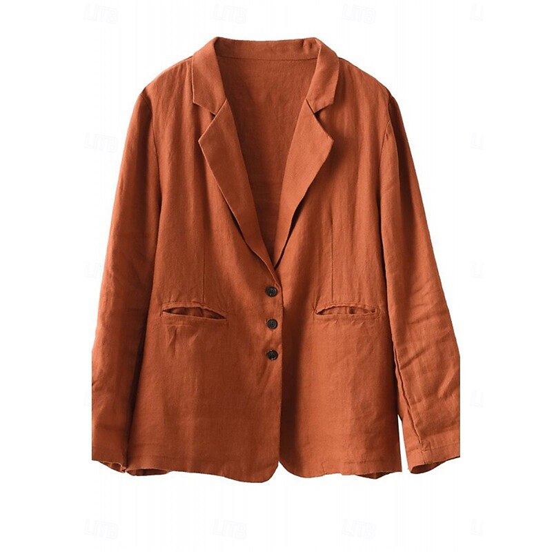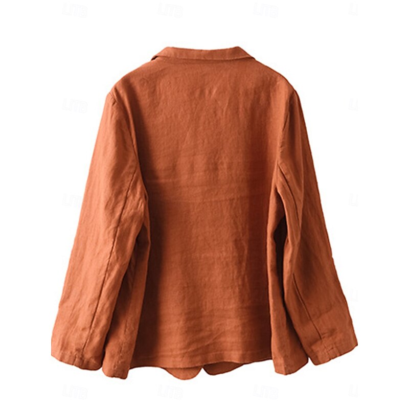 Highlights [Fabric]: Crafted from a high-quality linen cotton blend, this women's blazer offers a breathable and comfortable fit, making it suitable for the fall and winter seasons. The fabric's micro-elasticity ensures ease of movement throughout the day. [Fit]: The blazer is designed with a regular fit, featuring a relaxed, slightly oversized cut that adds a touch of effortless elegance to any ensemble. The long sleeves and regular outerwear length offer a classic silhouette. [Design Highlights]: This blazer features a classic turndown neckline with a notched lapel, enhancing its sophisticated appeal. It is equipped with a single-breasted button closure in the front, adding a timeless look. Two front pockets provide practicality and subtle texture contrast, while a solid color pattern ensures versatility in styling. [Occasions]: This versatile piece is ideal for work environments and can be styled for both casual and semi-formal settings. Its breathable and comfortable design makes it a go-to choice for various seasonal events, from office meetings to weekend gatherings. [Size Range]: Available in sizes M, L, XL, and 2XL, this blazer caters to a wide range of body types, ensuring a suitable fit for every occasion.