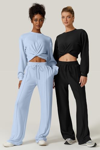 QINSEN Women 2 Piece Outfits Sweatsuit Set Twist Front Cropped Sweatshirt Wide Leg Sweatpant Lounge Set Tracksuit 2