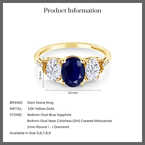 Gem Stone King 2.84 Cttw 10K Yellow Gold Blue Sapphire White Moissanite and Diamond 3-Stone Engagement Ring | Gemstone Birthstone | 3 Stone Wedding Anniversary Promise Ring For Women 6
