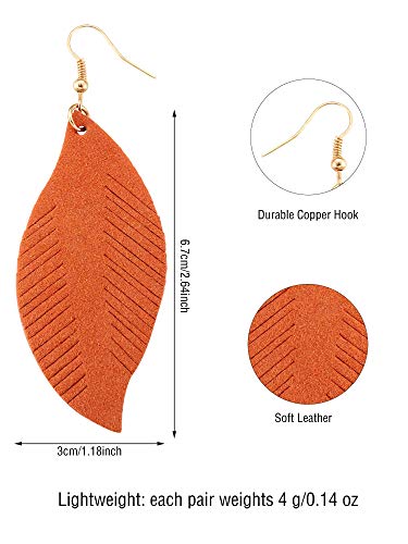 Item width: 1.18 inchesMaterial: Copper, Suede leatherMetal type: CopperBack Finding: French WireEarring design: Dangle8 Pairs earrings: you will get 8 pairs stunning leather earrings in different vibrant colors, easily to match many outfits and hairstyles, enough for your daily wearing and attending most occasionsLightweight and soft: these dangle earrings are made of suede leather, they are lightweight, won't burden your ears when wearing, ear hook is made of copper, durable and smooth, harmless to your earsEye-catching design: fashion earrings adopt feather shape design, bohemian style look unique and attractive, there are wonderful ornaments for women and girls, help you become the star in crowdElegant accessories: leaf earrings will dress up you more chic and elegant for attending party, dating, wedding, ceremonies, anniversary, holidays, banquet and daily wearingGorgeous gift: these charming suede feather earrings are great gifts to mother, daughter, wife and any other female friends on birthday, Valentine's Day, Mother's Day, New Year's Day, Christmas, anniversary and other important moments Perfect for everyday use. first-class materials and excellent craftsmanship ensure long-lasting durability.