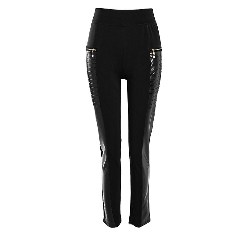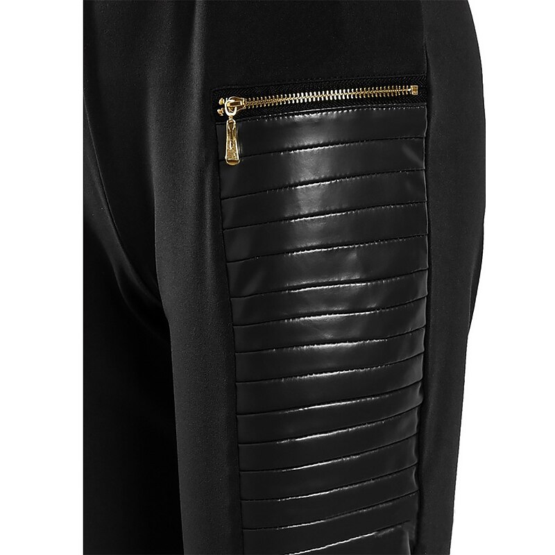 : Featuring a sleek color block pattern, these leggings are adorned with decorative gold zippered pockets on the front, adding an edgy sophistication to your look. The vertical ribbed detailing on the faux leather panels introduces a subtle biker-inspired vibe, while the high-cut waistline enhances their modern and fashionable appearance.