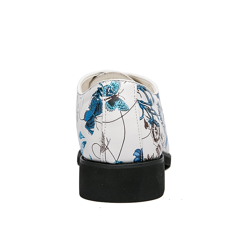 : These oxfords stand out with their floral embellishments, intricately printed in vibrant blue hues against an earthy backdrop, adding a modern twist to the traditional style. The contrast between the colorful upper and the black rubber sole creates a striking visual appeal, perfect for making a statement.