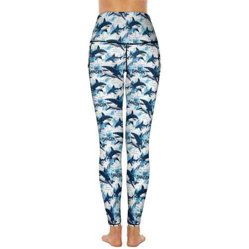 HOT ! Blue Cool Shark Print Leggings for Women - High Waisted Yoga Pants Gym Workout Leggings with Pockets