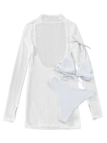 Lilosy Sexy Long Sleeve Mesh Swimsuit 3 Pieces Cover Up Bikini Set 4