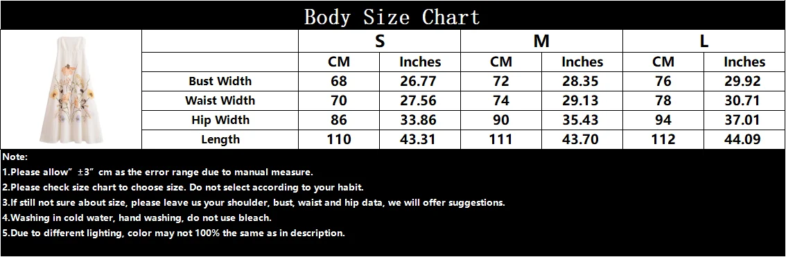 SPECIFICATIONSAge: Middle AgeBrand Name: TRAFZA(服饰)CN: JiangsuClosure Type: ZipperCraft of Weaving: TatDecoration: NoneDresses Length: Ankle-LengthElasticity: Slight StrechFabric Type: POLYESTERFit Type: SlimGender: WomenHign-concerned Chemical: NoneMaterial: POLYESTERMaterial Composition: synthetic fiberModel Number: W0315QQ882Neckline: StraplessOrigin: Mainland ChinaPattern Type: FloralPlace Of Origin: China (mainland)Profile Type: ARelease Date: Spring 2025Season: Spring/SummerSilhouette: A-LINESleeve Length(cm): SleevelessSleeve Style: StraplessStyle: High StreetType: Chest wrappingWaistline: Naturalsize_info: {sizeInfoList:[{length:{cm:68,inch:26.77},size:S,vid:100014064},{length:{cm:72,inch:28.35},size:M,vid:361386},{length:{cm:76,inch:29.92},size:L,vid:361385}]}