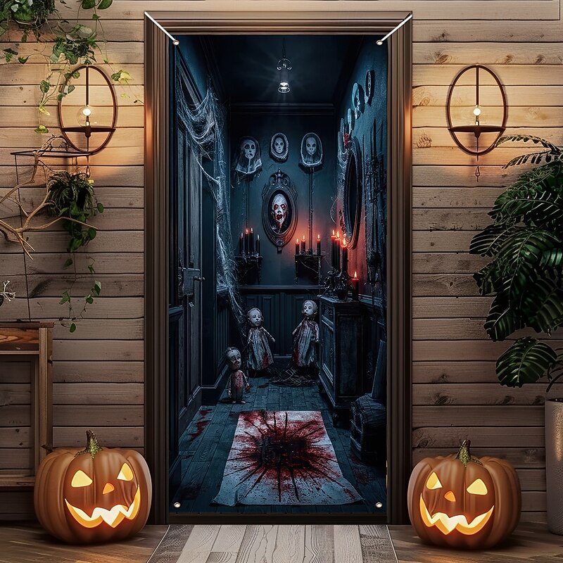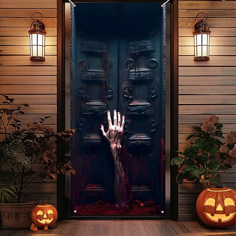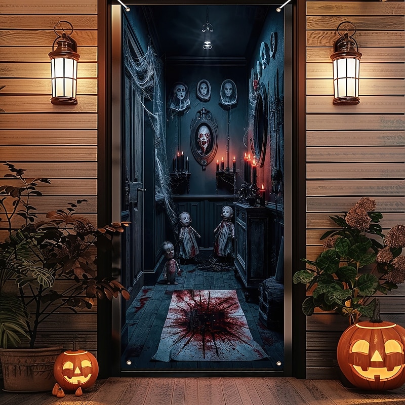 Halloween Door Cover Outdoor Banners Zombies 3D Psychedelic Dark Punk Gothic Style Party Outdoor Shooting Backgrounds Front Door Wall Porch Home Decor 10