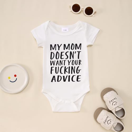 • 【Design】Funny infant girl boy bodysuit in letter printed "PASS ME TO grandma""MY MOM DOESN'T WANT YOUR FUCKING ADVICE". It has three snap buttons at the bottom for ease of access for fast diaper changes. The convenient envelope folds at the shoulders of the one-piece to help pull garment easily over baby's head.