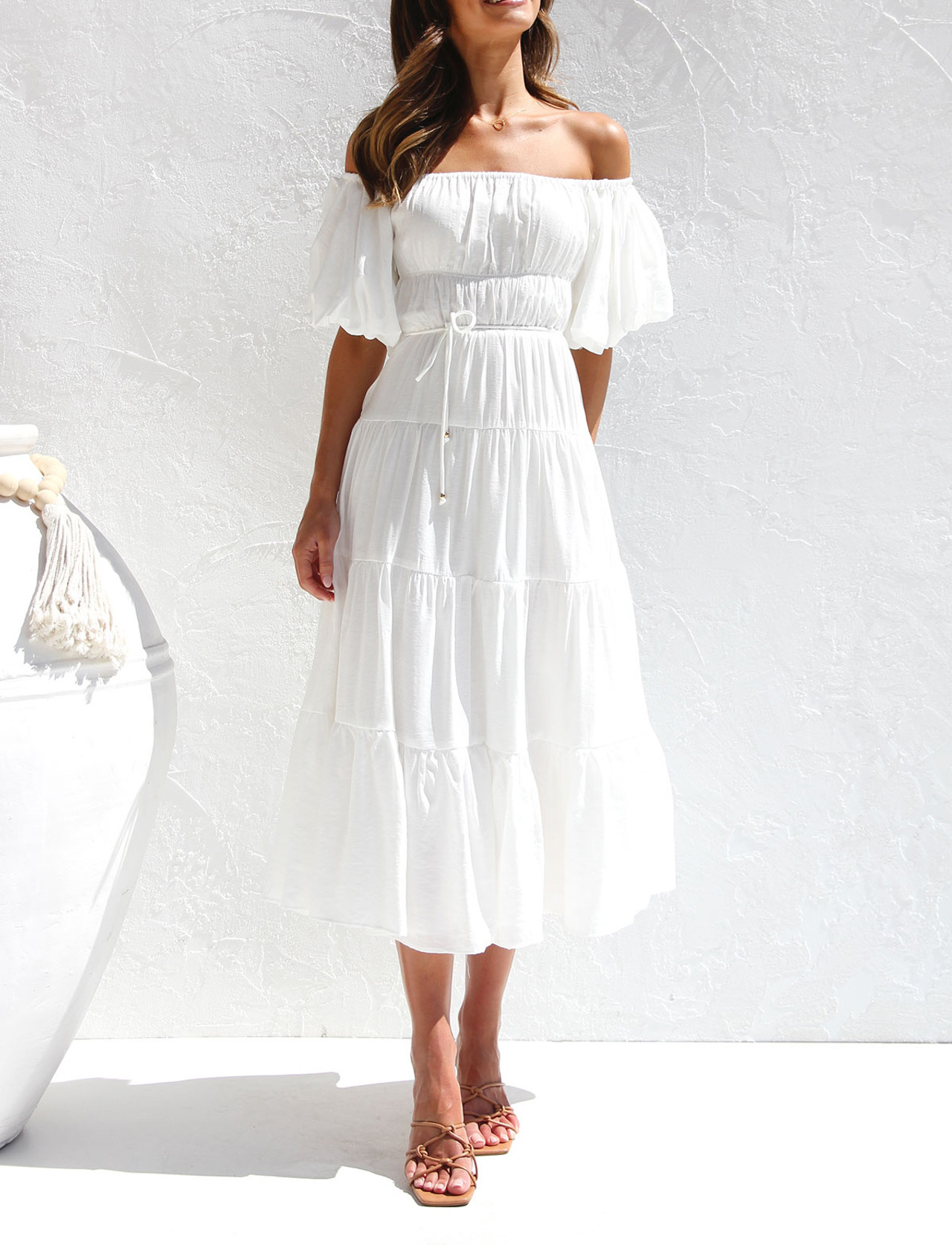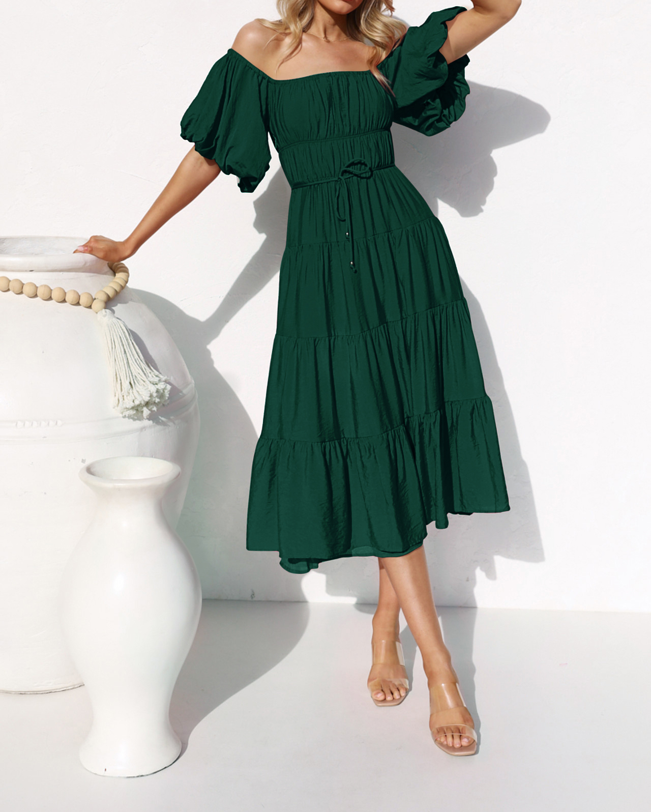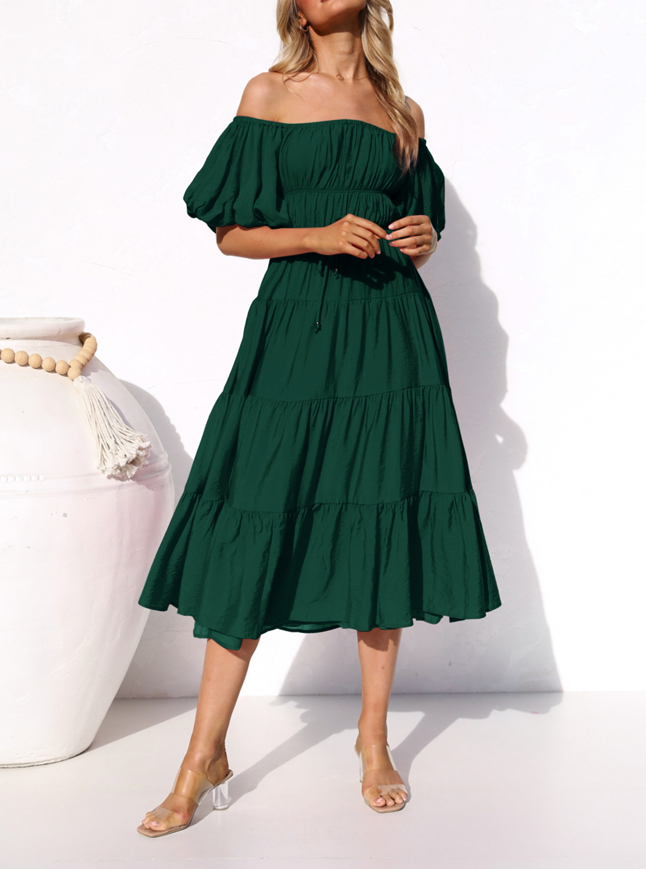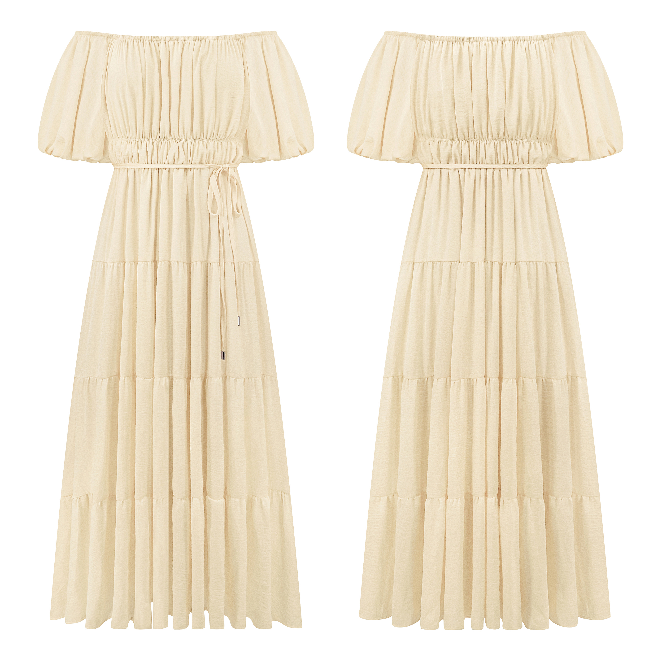 R.Vivimos Women's Summer Off-Shoulder Puff Sleeve Casual Midi Dress with Belt