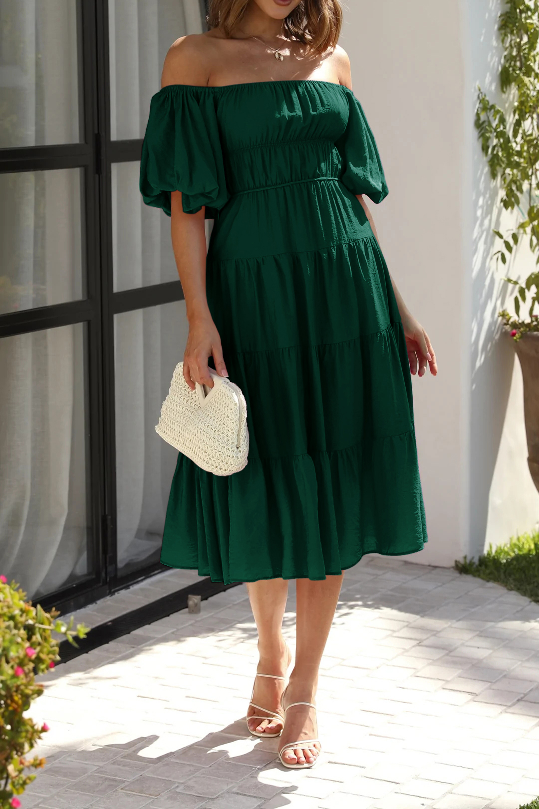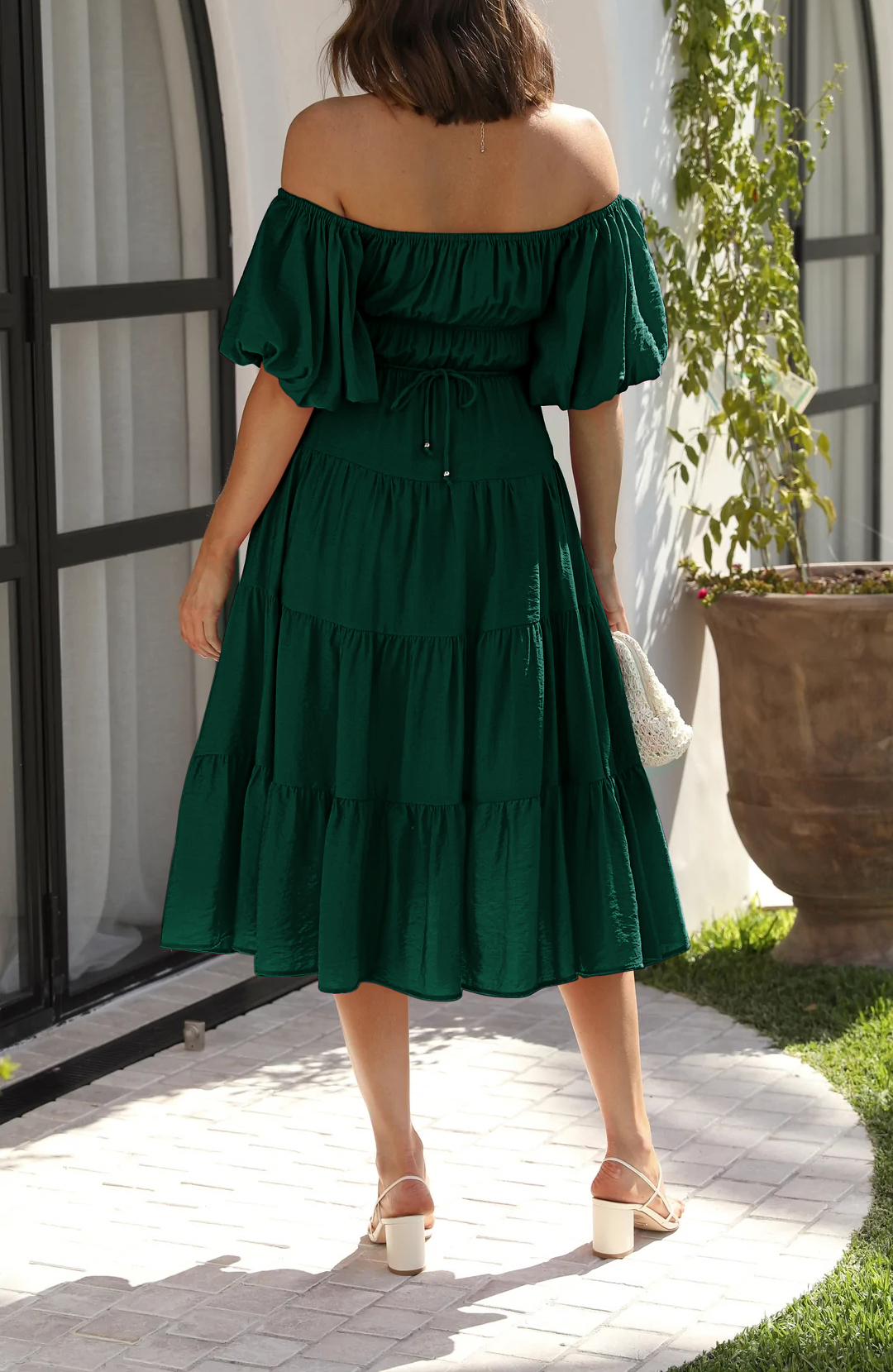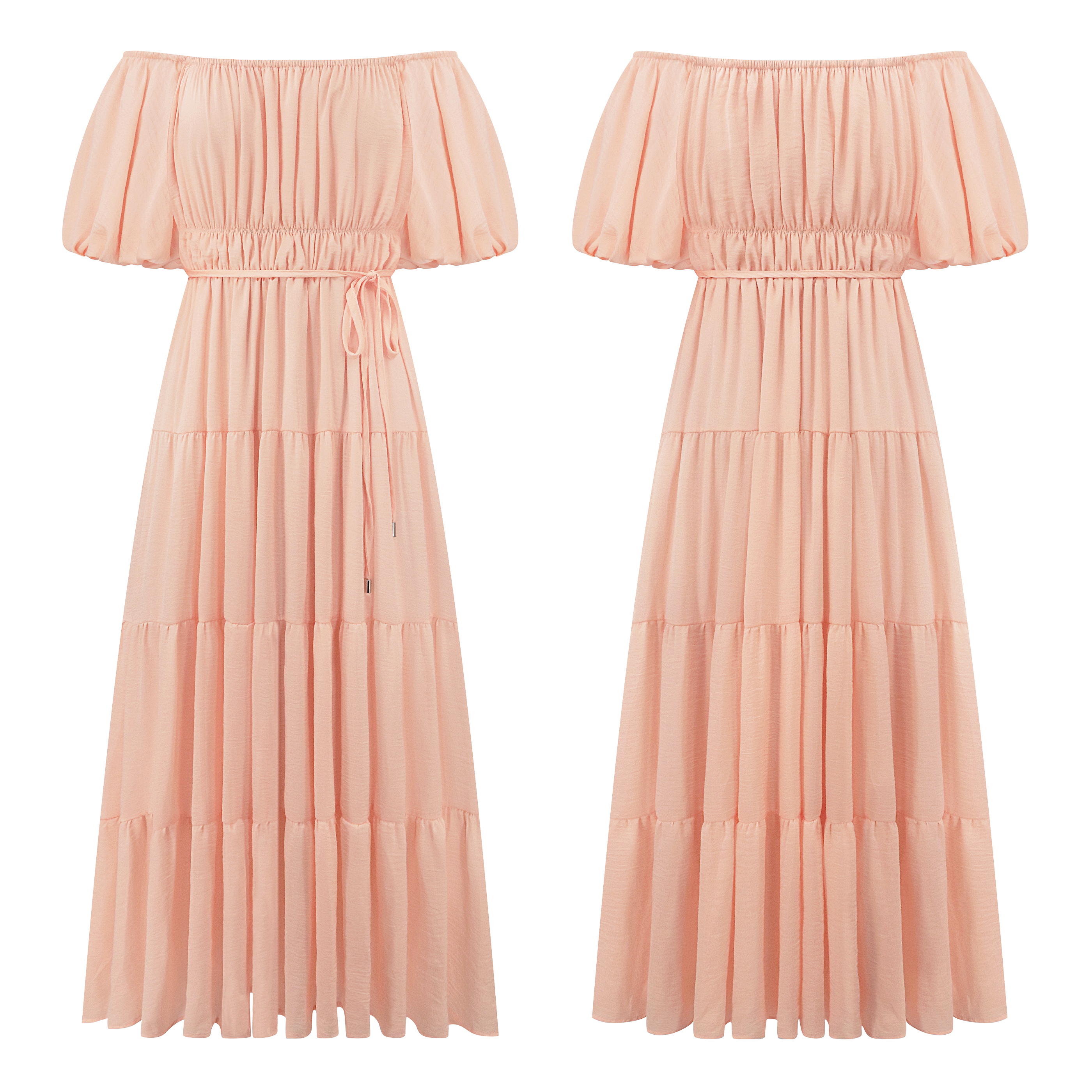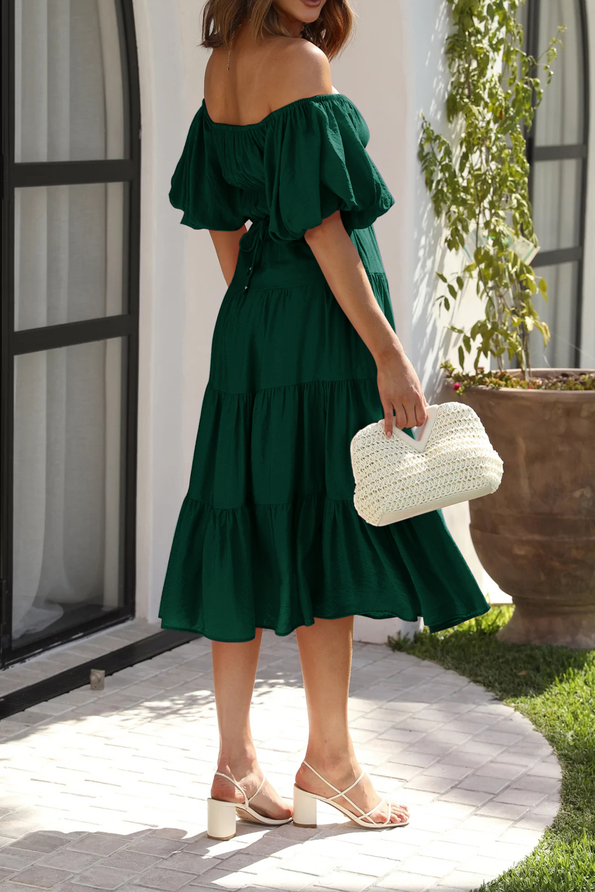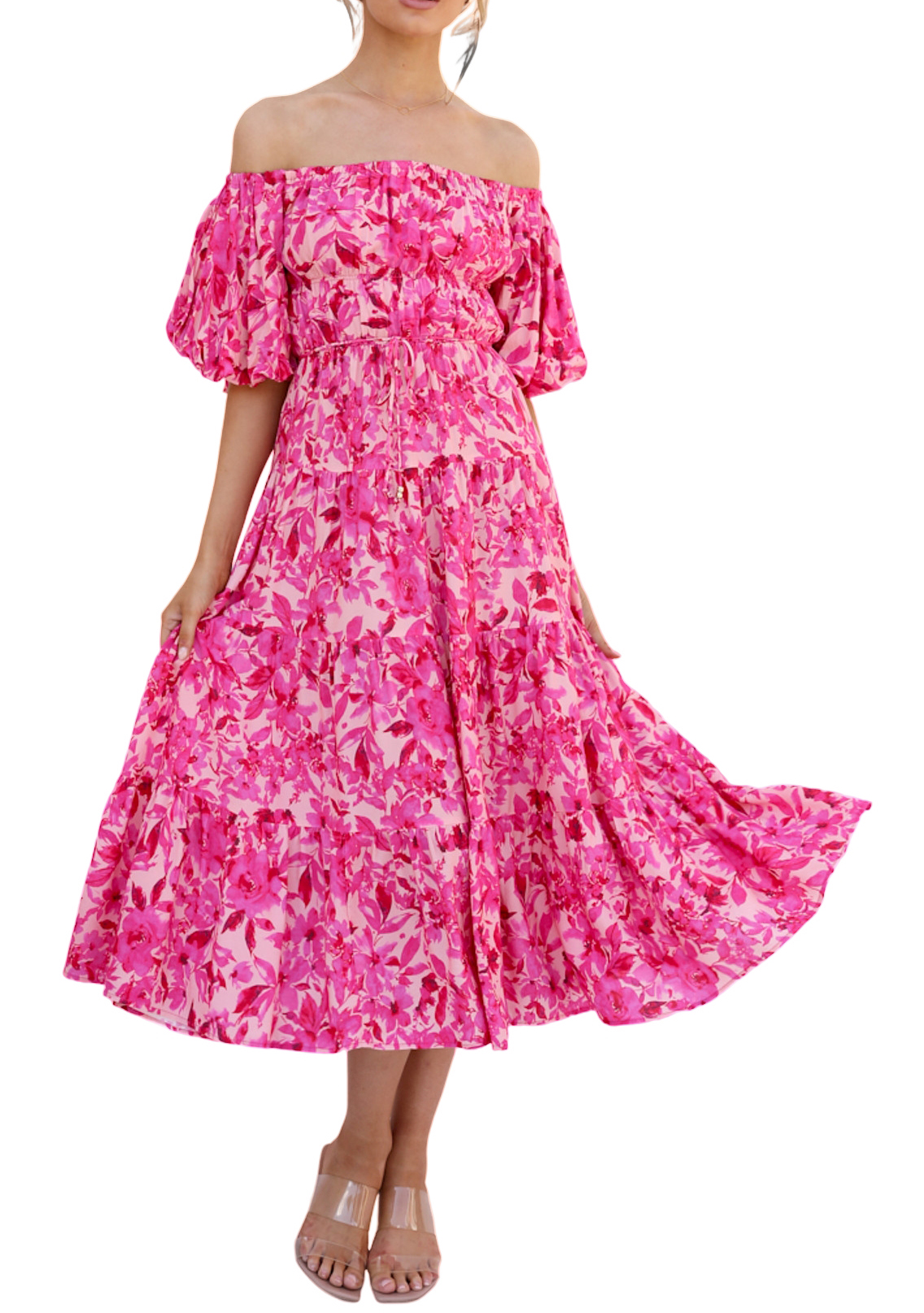 R.Vivimos Women's Summer Off-Shoulder Puff Sleeve Casual Midi Dress with Belt
