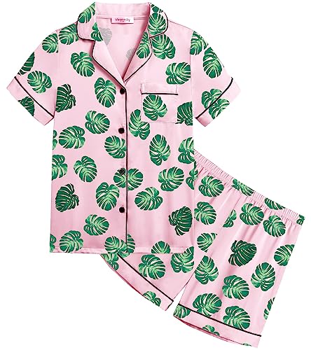 HOT ! Veseacky Unisex Satin Pajamas Set Boys Girls Silk Pjs Short Sleeve 2 Piece Sleepwear Button-Down Kids Nightwear(4-13T)