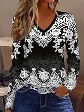More information about Women's T Shirt Graphic Plants Tribal Vintage Stylish Classic Long Sleeve V Neck Regular Tops Daily Print Black and White Spring Fall Winter